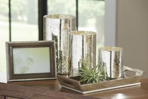 The Dexton Accessory set will bring an earthy elegance to your home with its richly distressed mercury glass and highly grained wood.