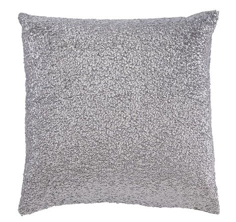 The Renegade pillow has a silver sequined solid cover mde from poyester. The pillow is filled with fiber and has a zipper cover.