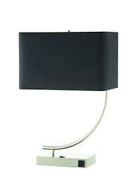 Features: Table lamp with base in a satin nickel finish, a black rectangular lamp shade, and a power outlet on the base.