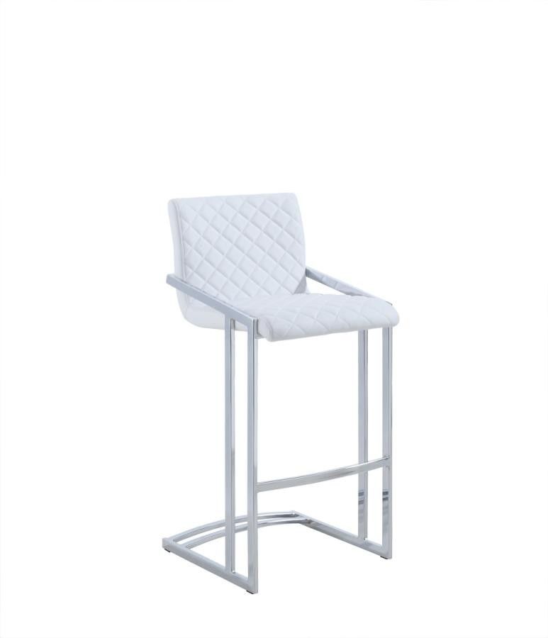 Bar Stool is sold individuallly with FREE shipping direct to you! This modern chrome bar stool is upholstered in a white leatherette. This set is contructed in steel with tufting on the seat.