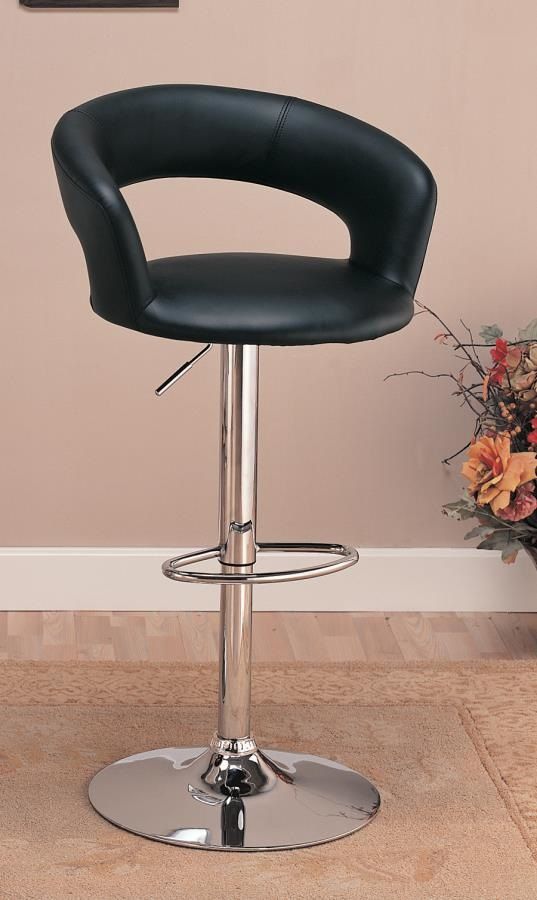 Bar Stool is sold individually with FREE shipping direct to you! This contemporary chrome bar stool is upholstered in a black leatherette with a unique design. This set is contructed in steel and has a hydraulic lift.