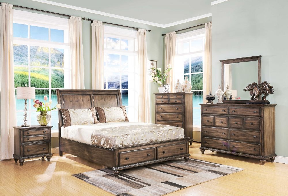 Fallbrook weathered brown storage platform bedroom set with chamfered edges. Extension 5 piece drawer box dovetailed front & back, storage footboard and chamfered edges offer unparalled value and quality.