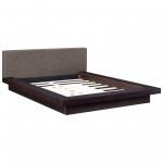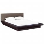 This simple and modern-style queen sized platform bedframe features a laminated base in a cappuccino finish with a foam-padded headboard upholstered in brown polyester fabric. It includes a slatted support system with a reinforced center beam, eliminating the need for any boxspring.