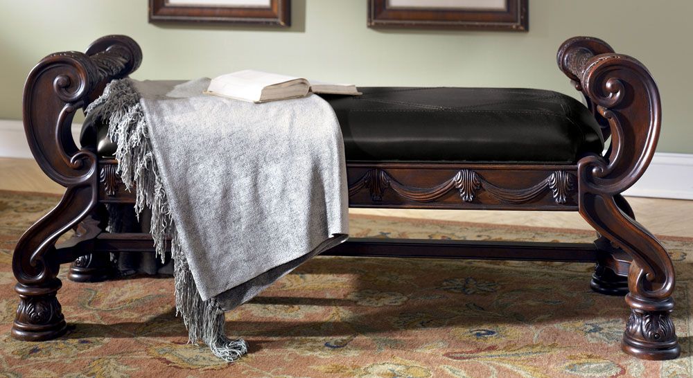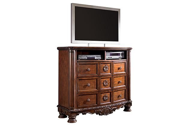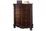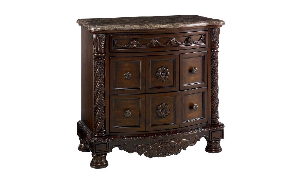 A rich traditional design and exquisite details come together to create the ultimate in the grand style of the "North Shore" bedroom collection. The opulent brown color flows beautifully over the decorative pilasters and ornate detailed appliques to create a rich elegant atmosphere to any home environment. With a serpentine shaped design and inlay stone veneer tops, this furniture collection takes traditional style to the next level. Transform your bedroom with the rich style of the "North Shore" bedroom collection.