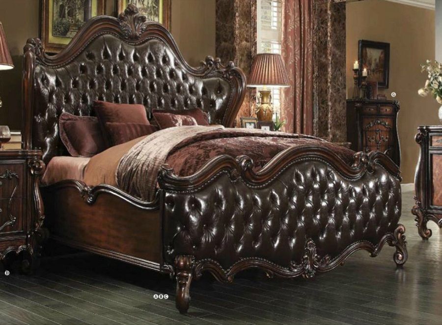Sleep like royalty with Versailles bed set. The bedroom set was inspired by old European design. The bed features carved scrollwork accent with nailhead trim decor and tufted upholstery on both headboard and footboard. The accent pieces crafted in wood with cherry oak veneer finish, and also included regal features such as ample storage, beveled mirror, felt lined drawers, and brown copper finish hardware. The carved details and cherry oak finish give a royal look to your bedroom space with this bed.