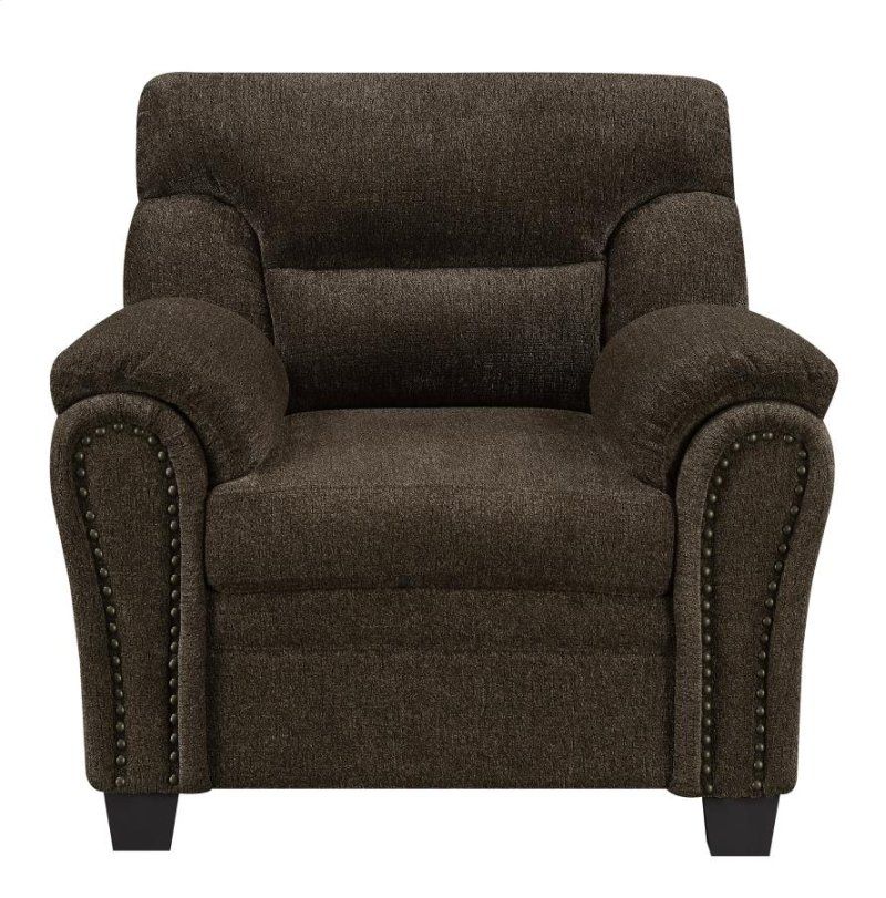 The Clemintine collection is upholstered in brown chenille fabric with nailhead trim. The pocket coil seating and extra padded arms will make this a comfortable set to own.