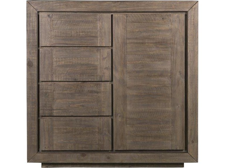 Granada Hills offers natural substance with a decidedly casual modern aesthetic. Thick pine veneers and solids are finished in a beachy pebblestone that contrasts the metal accents attractively. Dark bronze finished metal frames the three drawers of the multi-use bachelor chest and creates a smart square mirror.