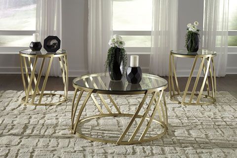 It's a modern beuaty to say the least. The coffee and end table set is finished in a luxurious hue and designed with attractive, angular legs. In addition, the clear glass tops and round shap keep your decor feeling breezy, open and contemporary. It's the perfect trifecta of style.