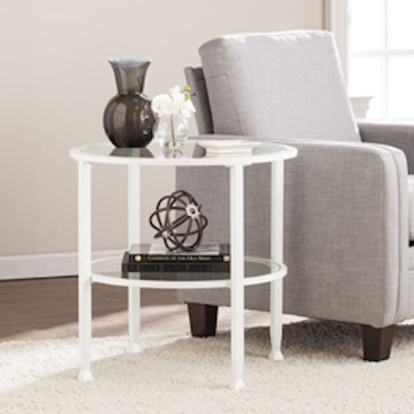 This crisp white metal and glass end table has a simple circular shape that the holds tempered glass tabletop and shelf. Crafting a slight shadowbox effect; open architecture easily displays all types of items. Shatter resistant tempered glass and durable metal construction give a sleek minimalist look.