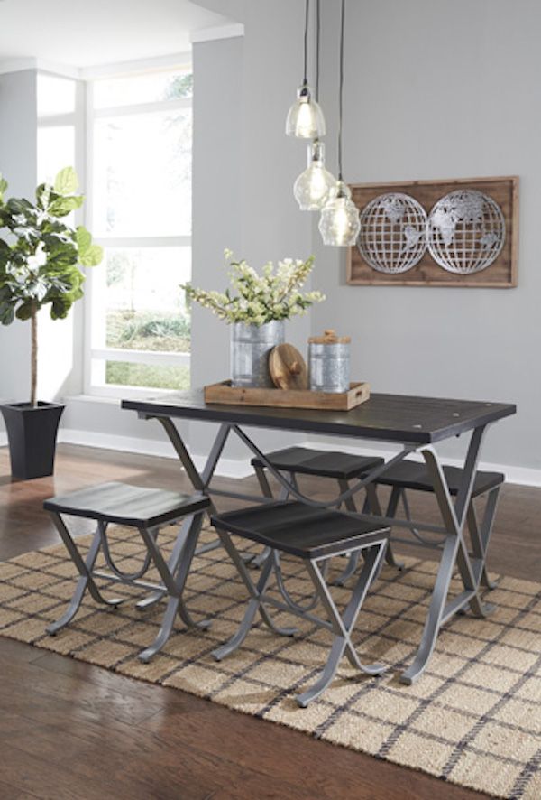 Elistree dining table set is a blend of sculptural gray metal with a distressed wood look that makes for a savory serving of urban hip and rustic industrial. Prominent saw marks, plank-style detailing and inset oversized nailheads give the “weathered” black tabletop distinctive character. The table top and seats are constructed with thick ash veneers over engineered board with a rustic distressed black finish. Planked veneer pattern with inset nail heads for added detail. Tubular steel frames are finished in a durable gray powder coat. Contoured seats and adjustable levelers. Dining stool dimensions: 18"W x 14"D x 19"H.