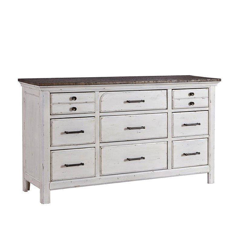 With its rustic farmhouse style, crisp white finish, and decorative accents, this Dresser offers a charming look to any bedroom. The top drawer features felt-lining, metal extension glides, and dual charger access while the durable, solid pine wood construction ensures years of use. Pair with other pieces in the Celeste Collection to create a cohesive vintage look.