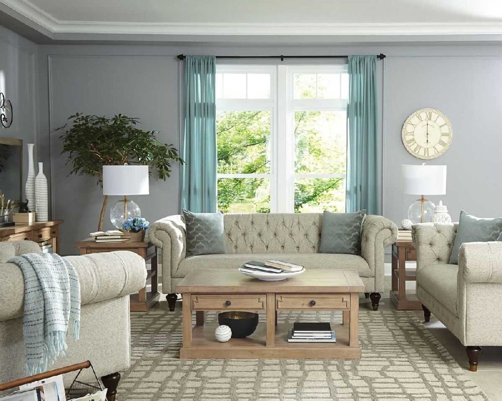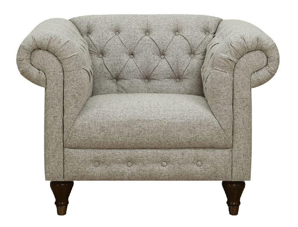Florence is a traditional and timeless design expressed in tufting, rolled arms and well tailored bench seat. Solid wood legs are accented with bronze metal caps. Sea foam throws compliment the tweed like textured fabric creating a stylish, yet lived in look.