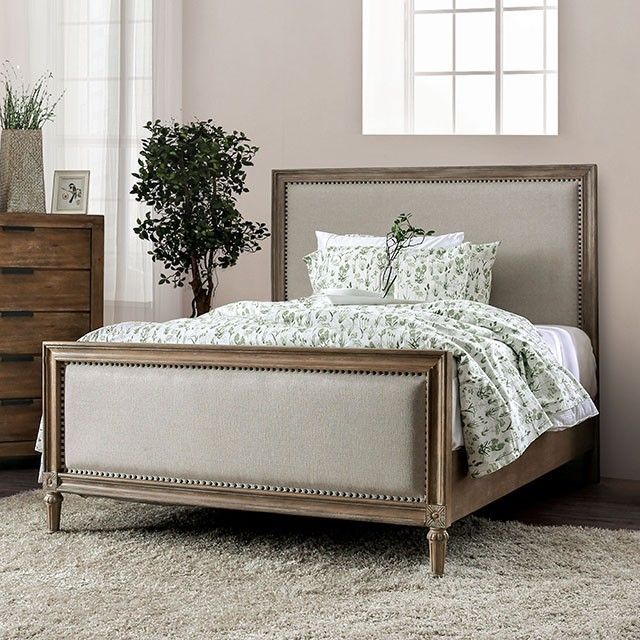 This bed has all of the warmth and rustic charm you can ask for. A square padded panel is lined by hand placed nailheads for a delicate feel that is mirrored by the matching footboard. The wooden framing is plain and neutral save for touches of elegance like fluted support legs and small floral crests that elevate the design this bed.