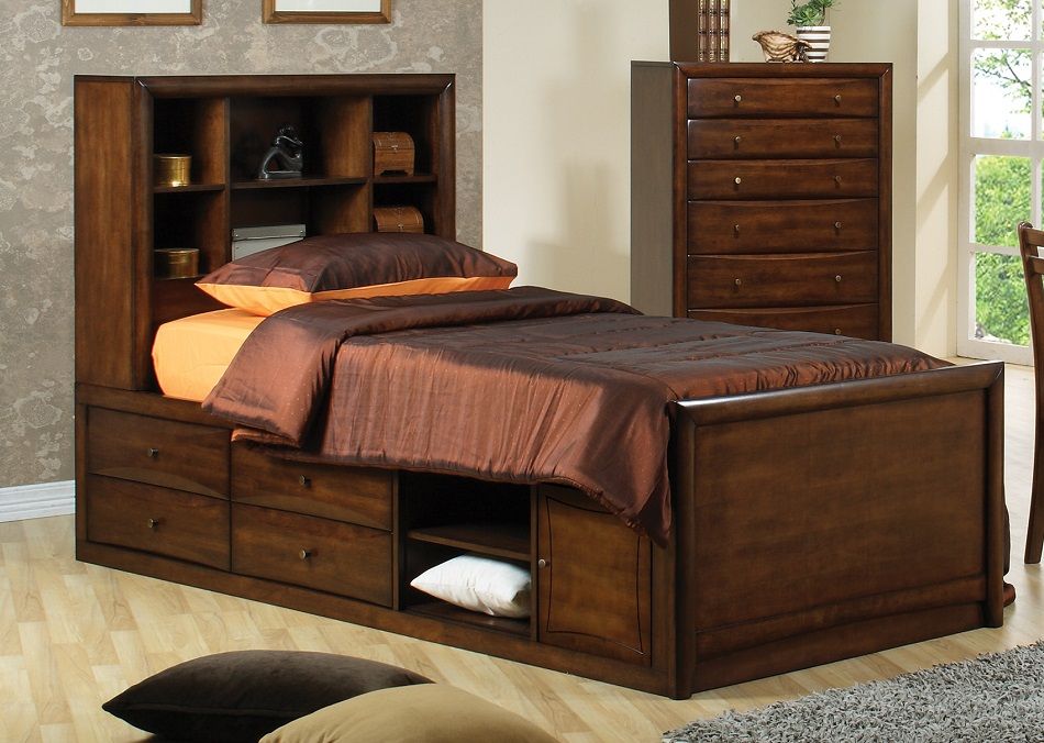 Walnut finish, available in Twin or Full sizes. Platform bed features durable wood glide drawer storage underneath the bed and is constructed of solid wood. All drawers have bevelled wood fronts and are accented with brushed nickle hardware. Bed requires assembly