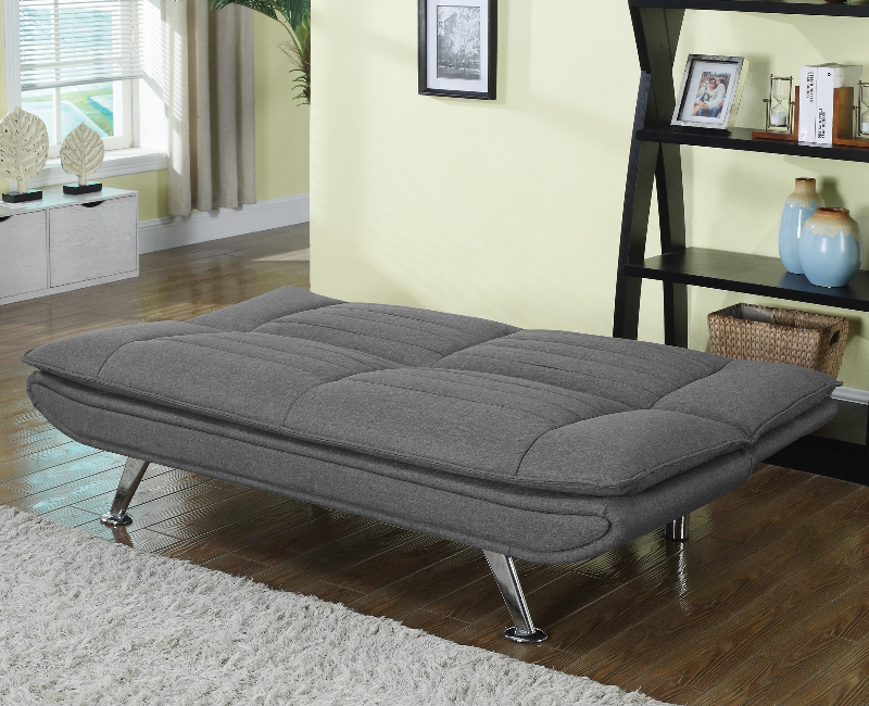 A futon for a professional. This futon is perfect for those that need a nice looking sofa during the day but also need a place to crash when doing overnighters at work. The neutral gray and chrome finished legs mesh with any office space.
