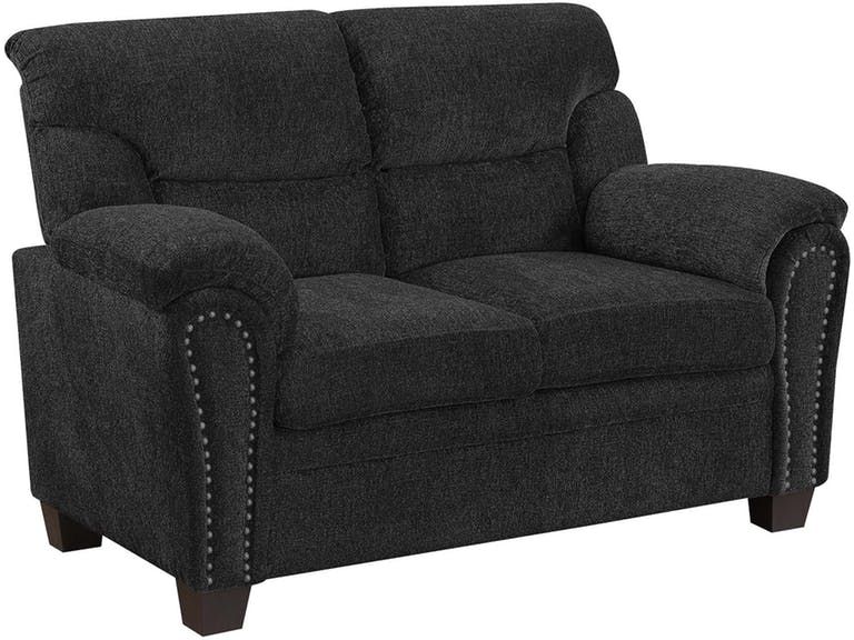 The Clemintine collection is upholstered in graphite chenille fabric with nailhead trim. The pocket coil seating and extra padded arms will make this a comfortable set to own.