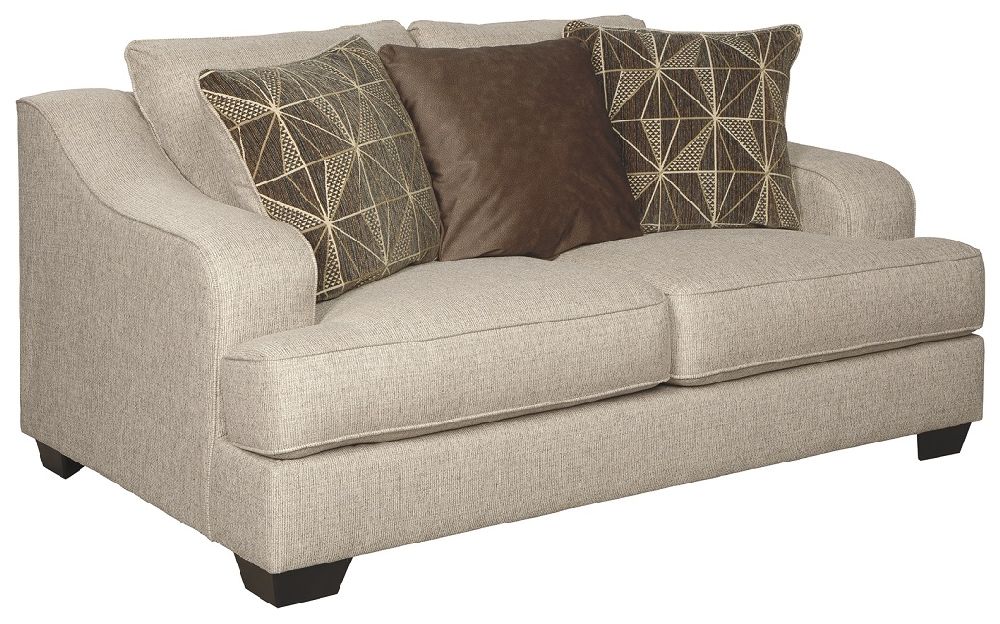 “Let’s stay home.” Why not? It’s so easy to do with this sofa. Tantalizing fabric texture and sloped arms encourage a comfy sit-down. And when you need to fluff up the cushions, simply reverse them. Neutral color ties right in with your existing decor. Throw pillows in contemporary, geometric pattern and solid brown complement the scripted kidney pillow beautifully.