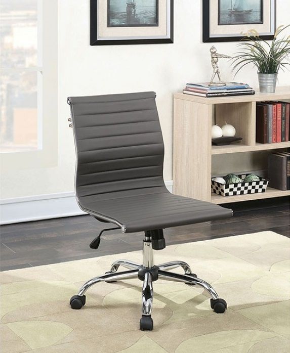 The Armour collection is available in three colors. This sleek contemporary design office chair has gray leatherette and no arm rests.