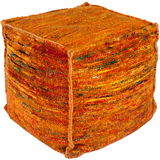 The pouf is sold individually and ships free directly to you! The Bazaar pouf is a red, orange, yellow and emerald colorway and is woven.