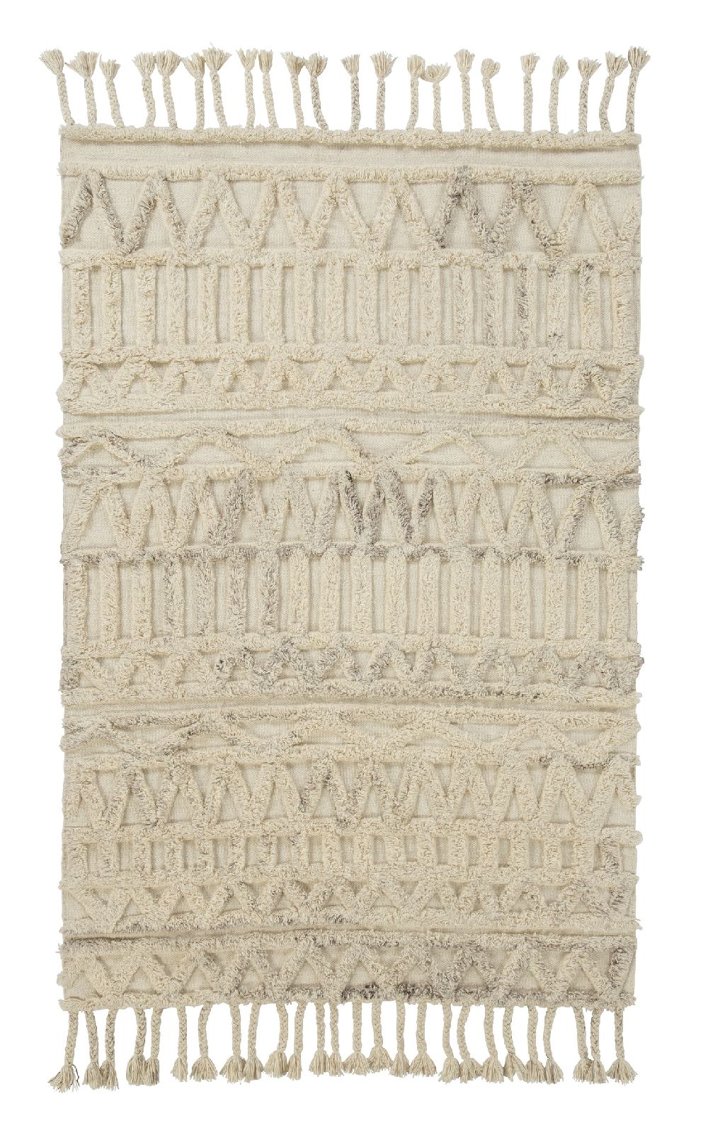 The Eleva Natural medium rug by Ashley furniture sports a one hundred percent hand tufted Moroccan desgn in natural wool hues.
