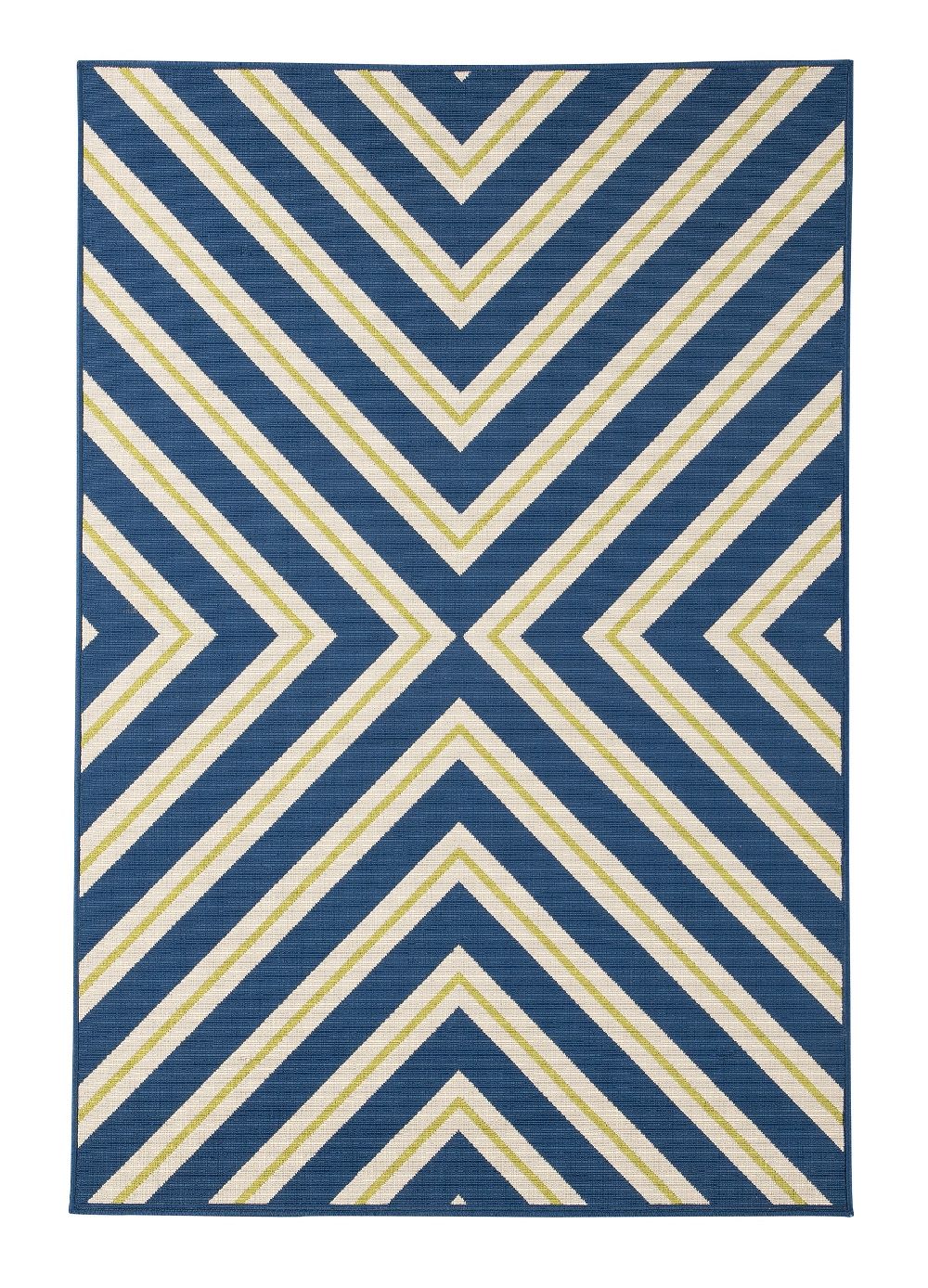 The Metrie medium rug by Ashley wears a bold geometric line pattern in navy, lime green and cream colors. Machine woven and 100% Polypropylene.