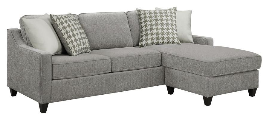 The Montgomery collection is upholstered in charcoal chevron dobby fabric. This small sectional will allow you to lie back and relax with the chaise feature.