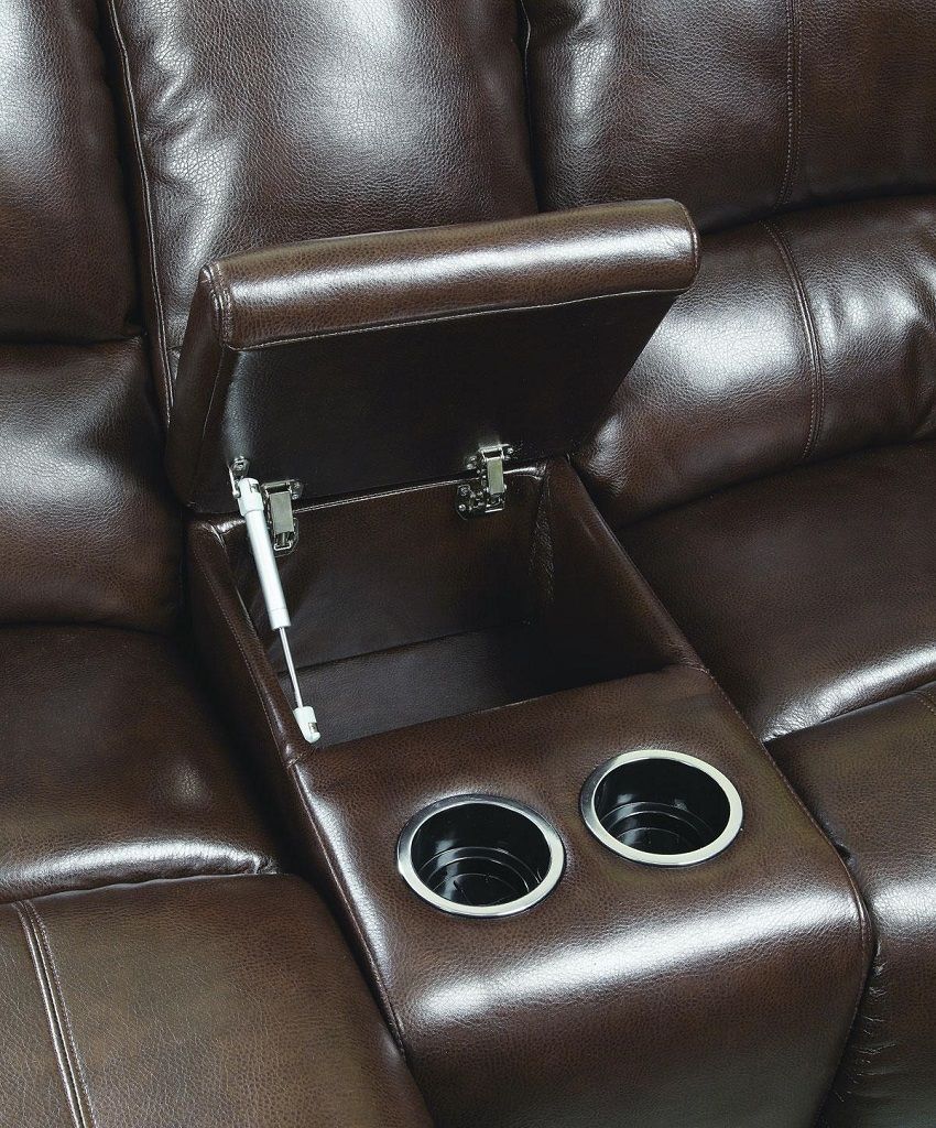 Mackenzie chestnut bonded leather reclining sectional with chaise and console. Console features storage and space for two drinks. Kidney back support , pocket coil spring seating help you melt into this item from the moment you sit in it. Baseball stitching bring function and added design to the set.