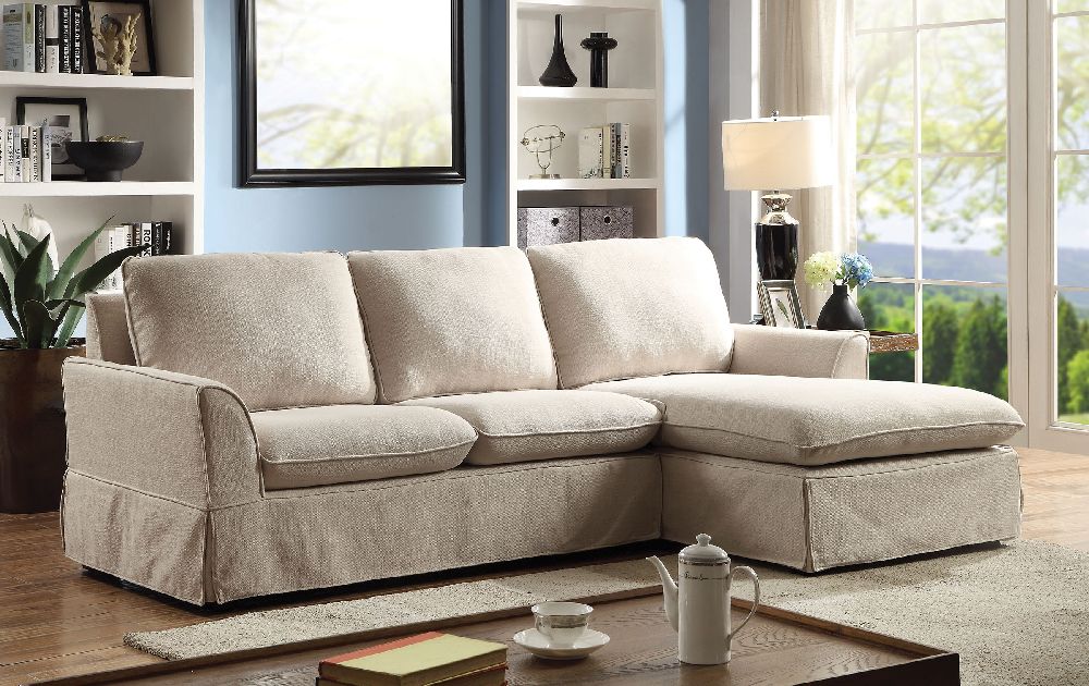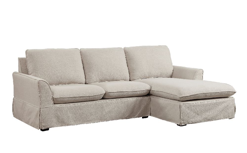 Maxine beige shirt and flared arm sectional. Knife edge cushion, flared arms and skirt make this simple yet chic.