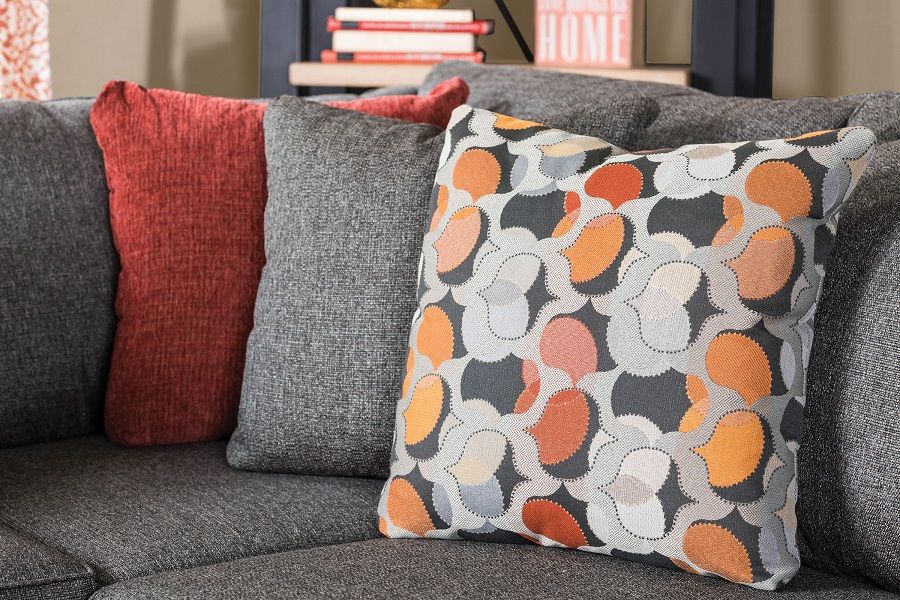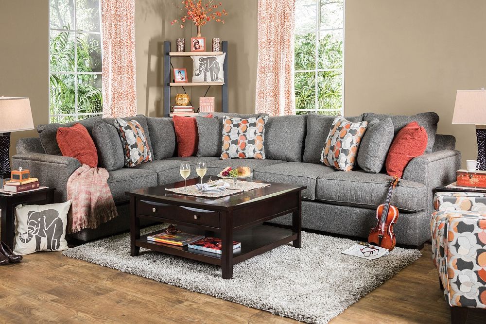 Pennington grey sectional sofa. Curved armrest, t seat cushions and nine throw pillows bring extra appeal to your homes look with this addition. Anticipate the comfort waiting for you at home every night as this sectional offers the perfect environment to relax and unwind.