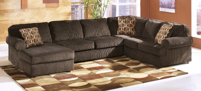 Vista sectional in a chocolate corduroy with rolled arms and plush comfort. The large sectional has a large chaise and plenty of seating for you and all your guest and family.