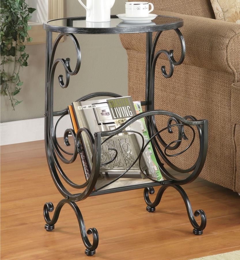 Gunmetal magazine table by Coaster has a built in magazine rack made with metal legs and a glass top