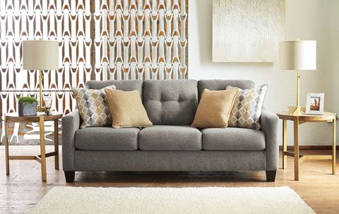 Contemporary with a touch of mid-century flair. The sofa’s box cushion styling is accented with button-tufting and sloped track arms that go with the flow. Inspired by tailored menswear, the gorgeous gray upholstery with chenille-feel softness is complemented with solid and print pillows in butterscotch and gray.