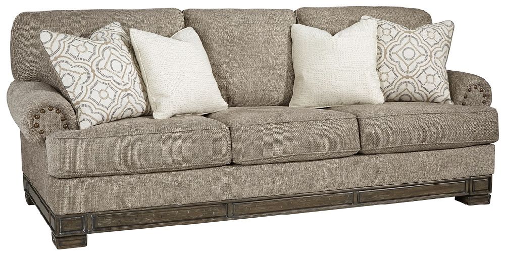 This standout sofa invites you to bring home a richly substantial look at a remarkably comfortable price. Cool, classic elements include flared roll arms punctuated with nailhead trim and a chenille-feel fabric with loads of chunky texture. Gently distressed finish on the exposed rail infuses a relaxed sensibility that feels like home.