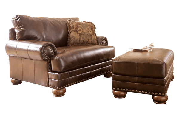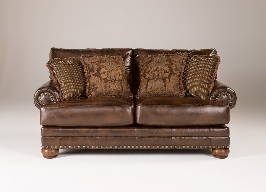 Blended Leather Match upholstery features a Polyurethane/Leather blend in the seating areas with skillfully matched Polyurethane everywhere else. The rich contemporary design of the "Chaling DuraBlend®-Antique" upholstery collection features a rich traditional design with warm finished bun feet and nailhead accents that create a sophisticated look that is sure to enhance any living room decor. With the thick rolled arms and supportive seating and back cushioning, this furniture collection adds a deep comfort perfect for any living environment. Create a relaxing environment with the inviting comfort of the "Chaling DuraBlend®-Antique" upholstery collection.