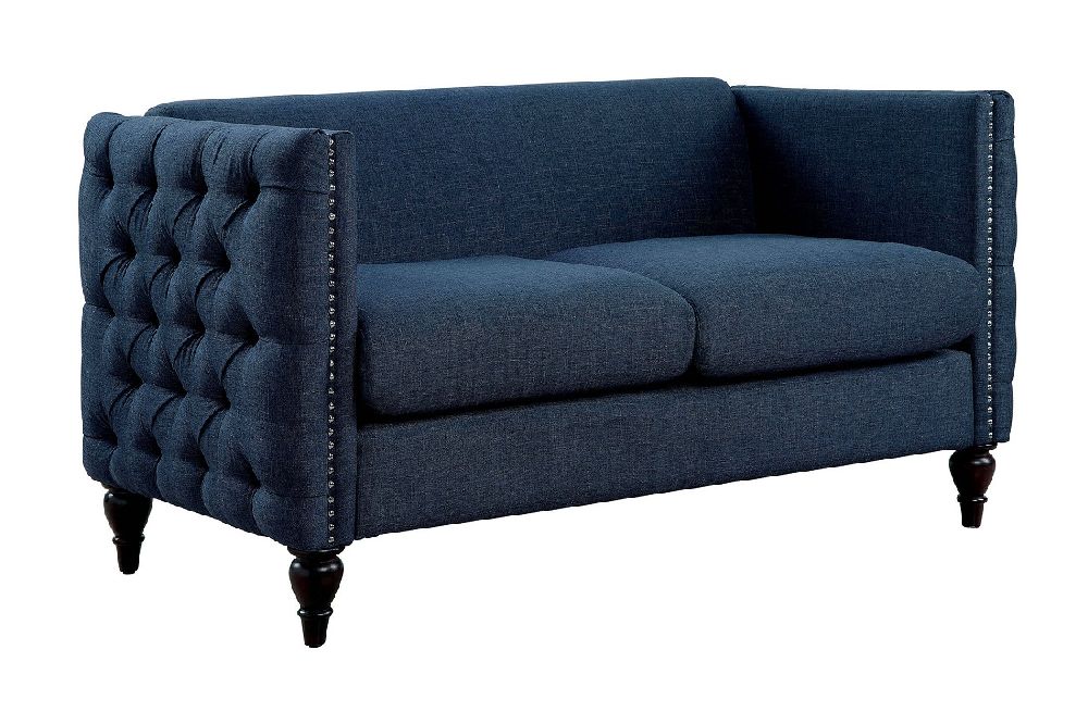 The Emer collection has a deep tufted with espresso turned legs. The dark blue linen-like fabric and nailhead trim will give off a luxury look that will give life to any living room decor.