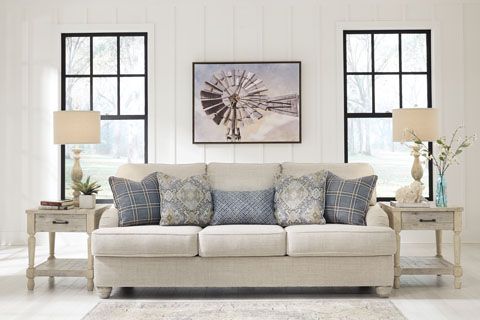 The Traemore sofa by Ashley furniture wears a soft linen fabric upholstery with plush seats. The clean lines and contemporary design makes it a great choice for many homes.