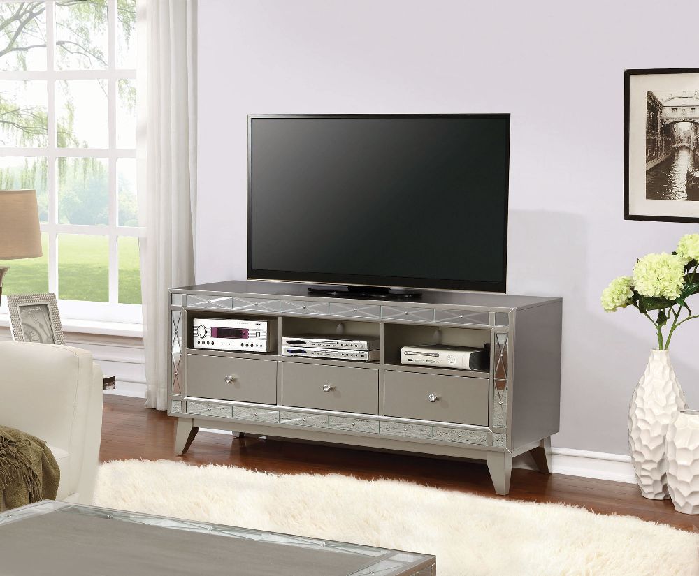 Genuine mirrors line the border on the front of this modern TV stand. Put up to a 60" TV and store all your electronics on or in the storage compartments. Tv stand is finished in a mercury color.