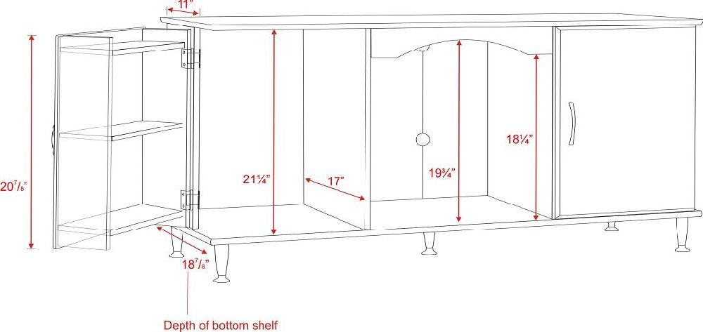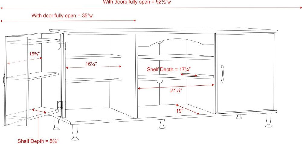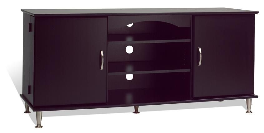 Designed for Plasma and LCD TVs up to 60 inches, this stylish black console offers ample storage for Audio / Video components and your media. There are two adjustable center shelves measuring 21 inches wide to accommodate stereo equipment and sliding rear panels to provide convenient access to cables and connections. Five adjustable legs provide a solid base and can compensate for uneven floors. Legs and handles in brushed metal are a complement to the black or cherry laminate finish. Doors swing open to reveal DVD / CD storage with six adjustable shelves. Capacity: 462 CDs, 212 DVDs, 308 Blu-ray discs, 164 videos. Constructed from high quality laminated composite woods. Assembled Dimensions: 58"W x 26.75"H x 19.75"D. Assembly Required.
