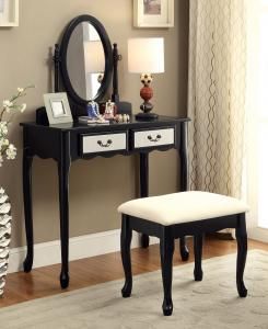 Prep yourself in style with this wooden black vanity collection that features two storage drawers, an oval mirror, padded stool, and cabriole legs for extra elegance. Also available in white and silver.